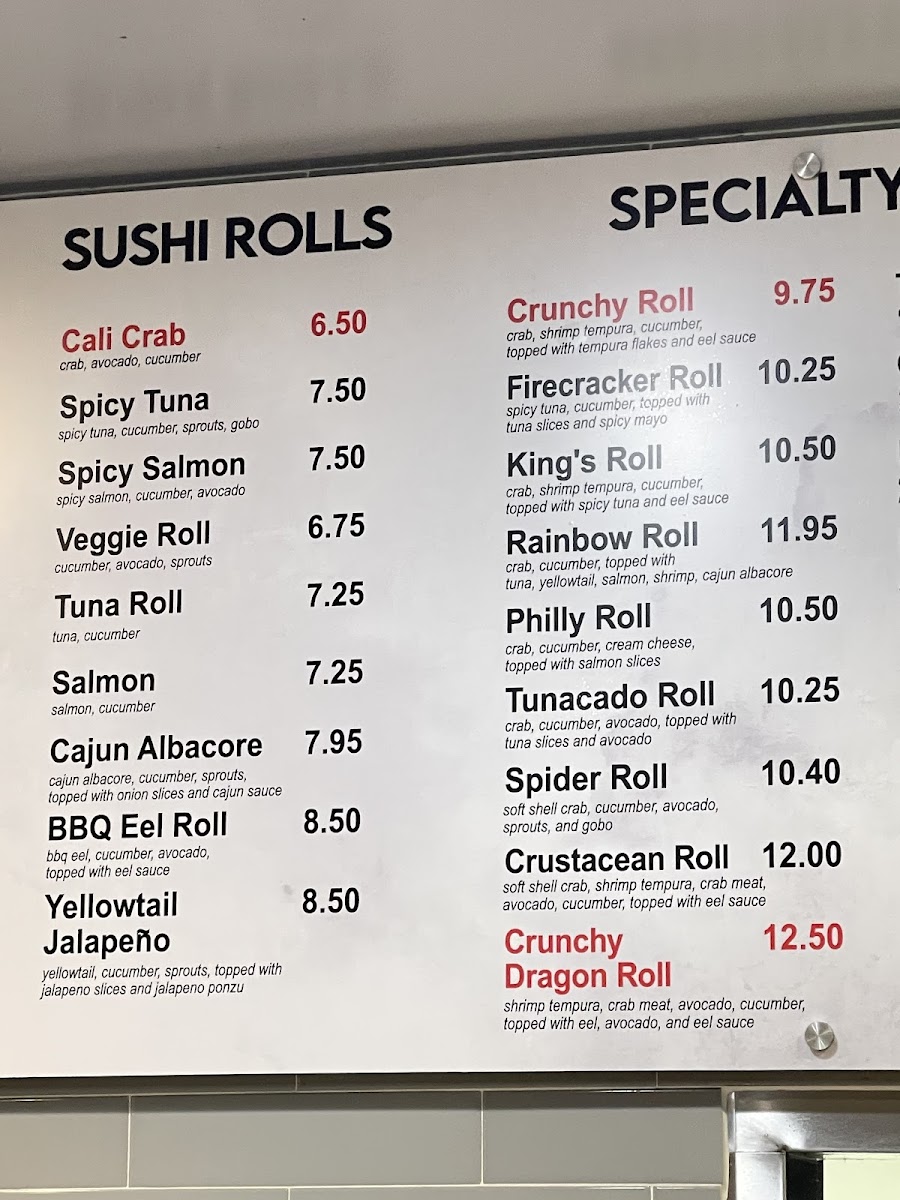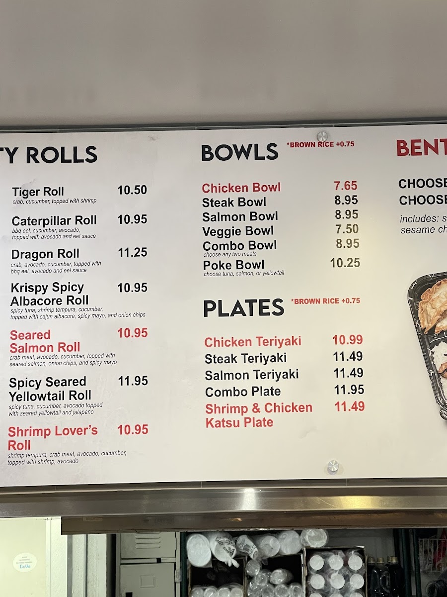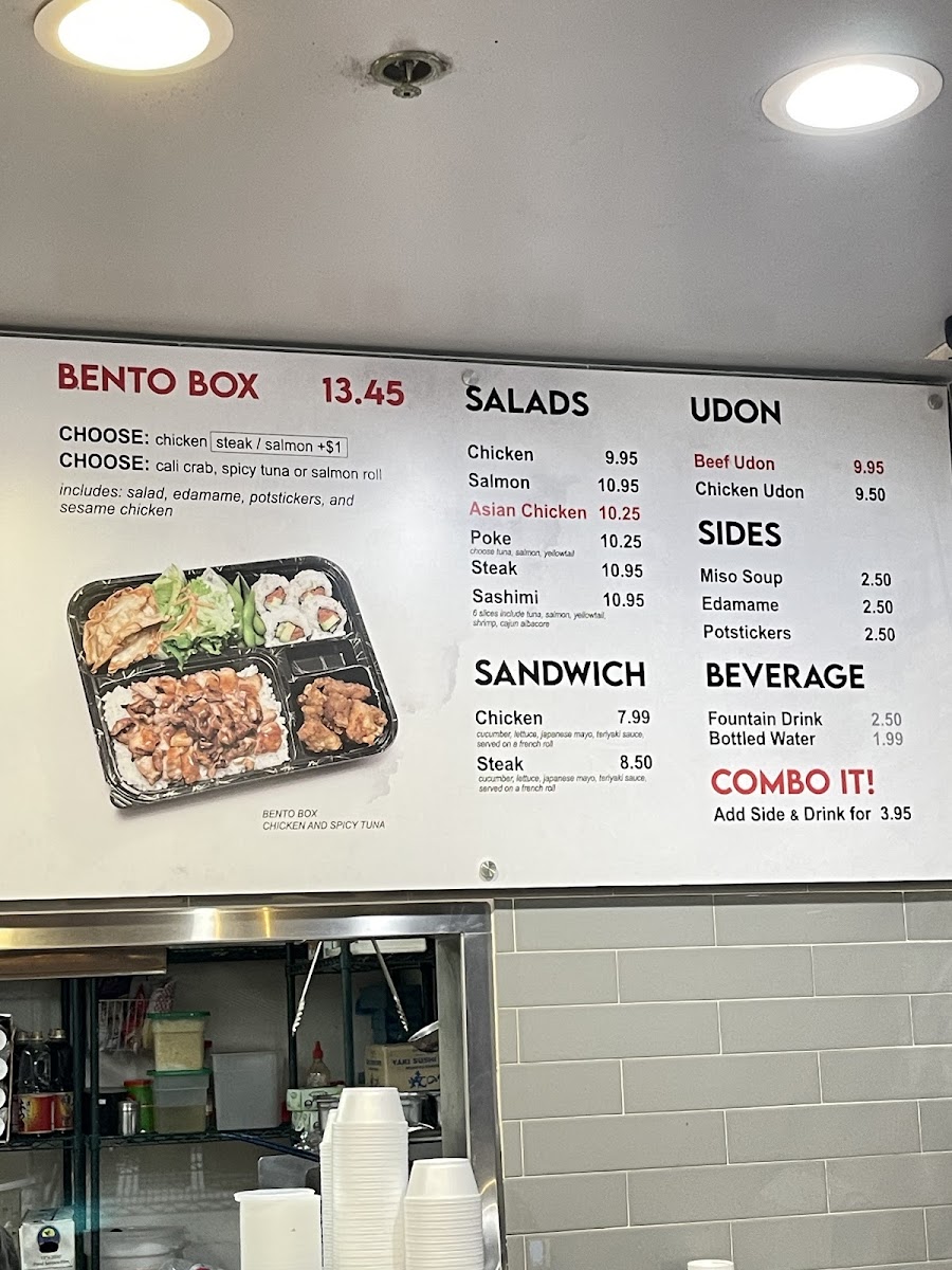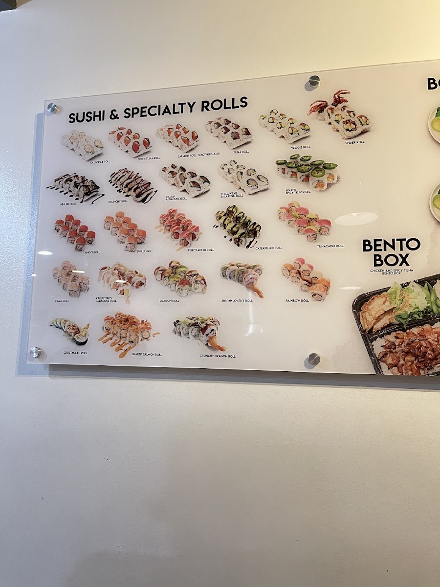 This menu suits a casual dining setting and is appropriate for lunch or dinner, with options that accommodate both quick orders and more filling meal choices. Patrons can select from a range of sushi rolls, combination plates, and bento-style meals to fit different appetites and preferences.