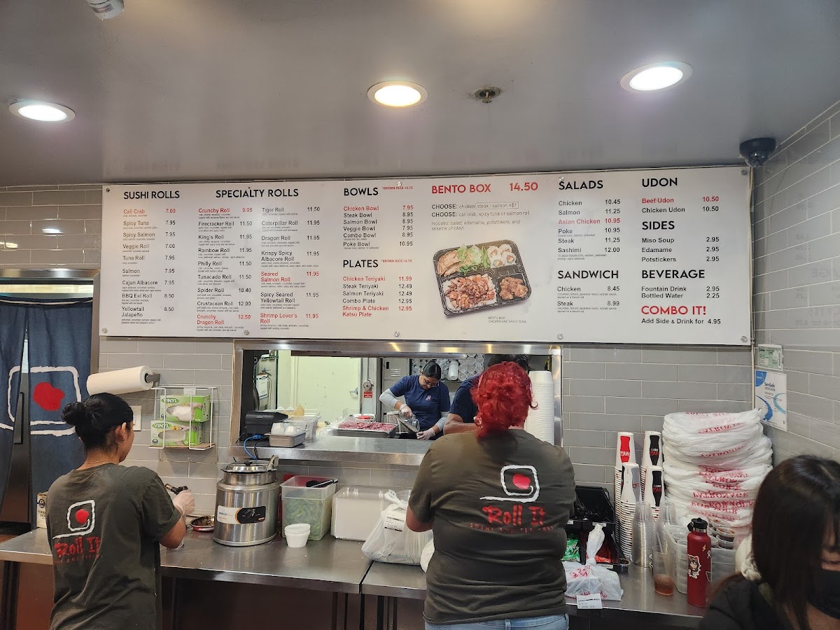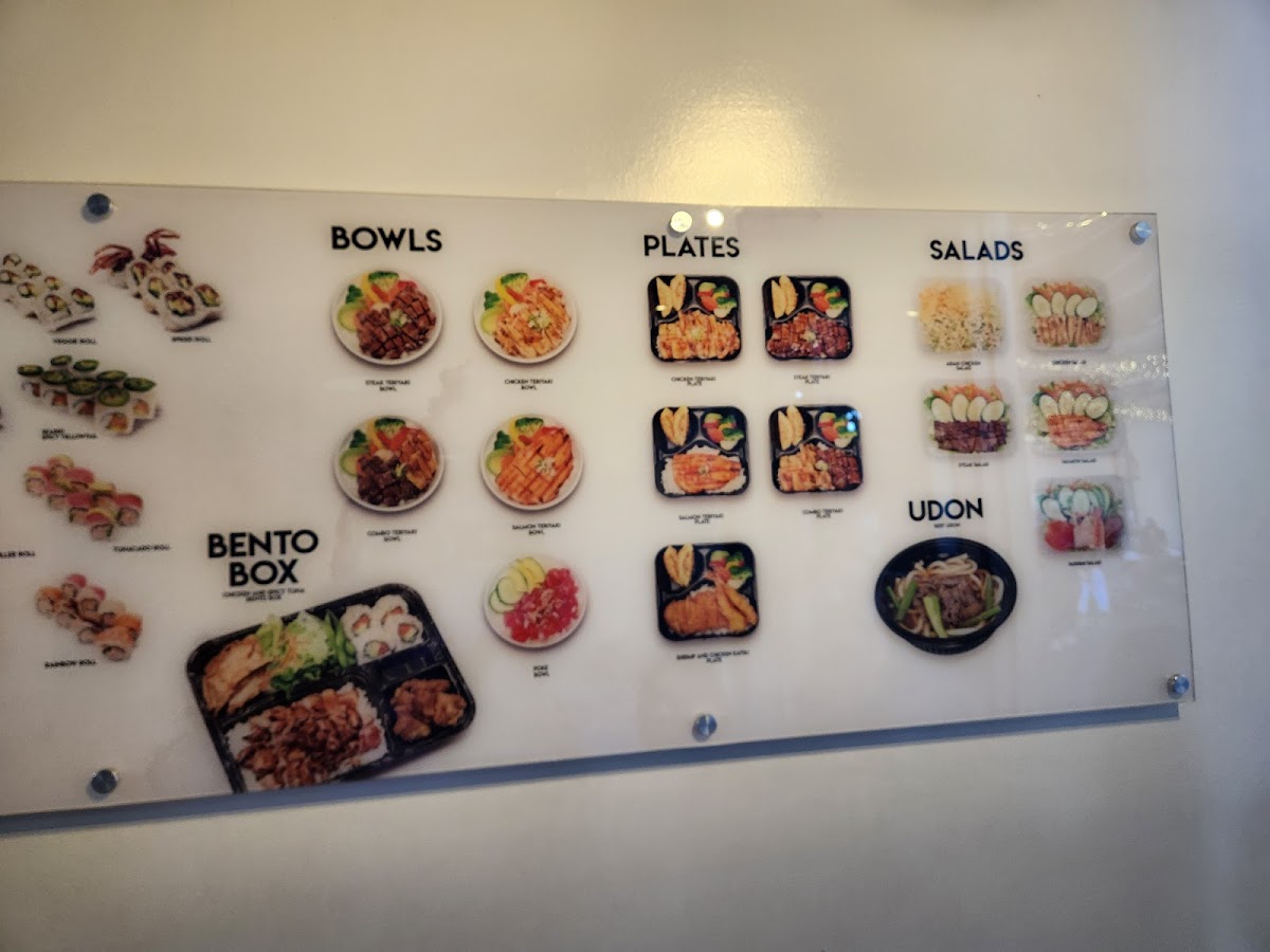 The menu also highlights several popular dishes such as Combo Teriyaki plates, various sushi rolls including California Crab Roll, Spicy Tuna Roll, Spider Roll, Tiger Roll Shrimp Lover, as well as items like Chicken Bowl, Potstickers, Shrimp and Chicken Katsu Plate, Seared Salmon Roll, and Beef Udon Soup.