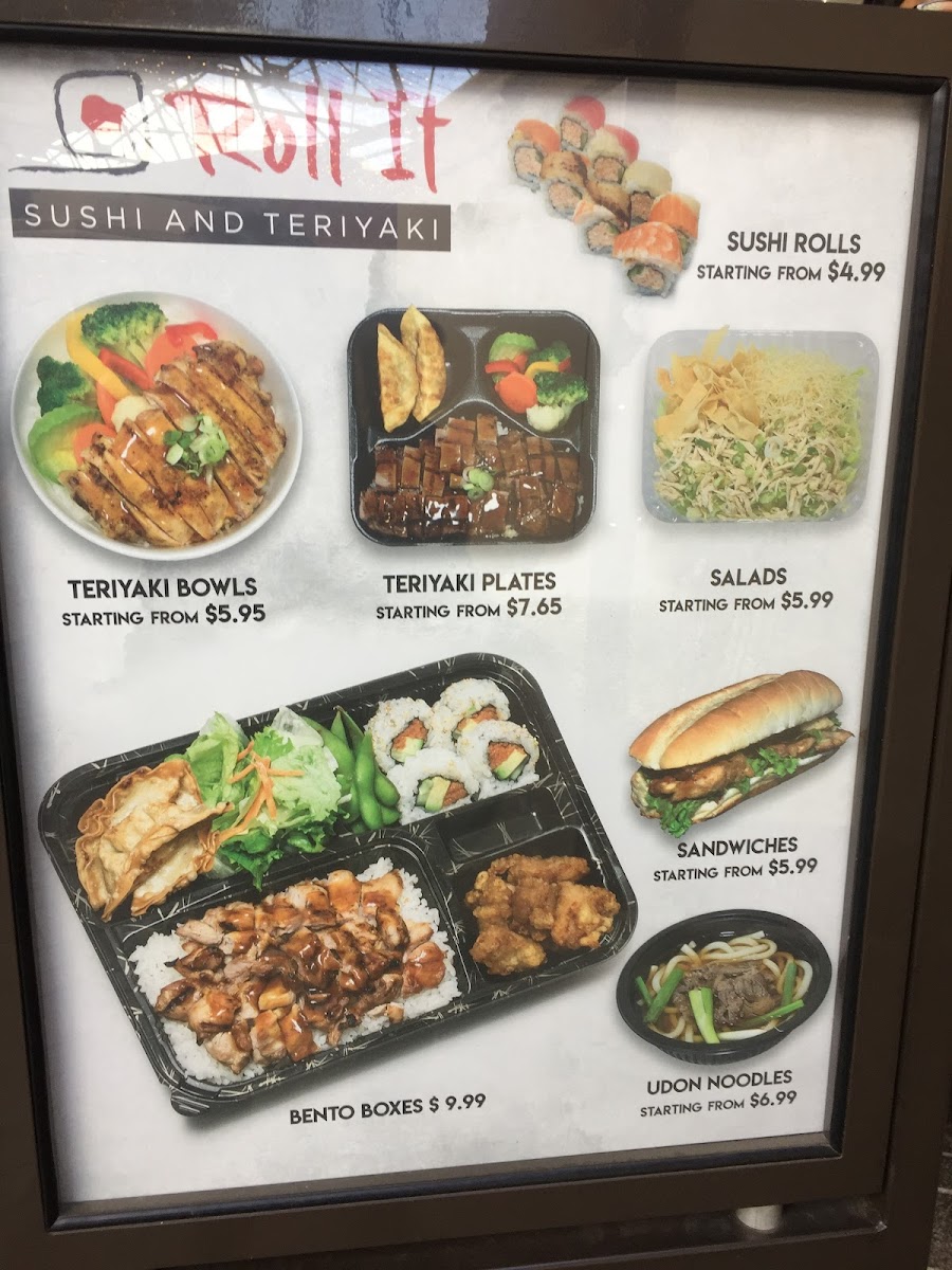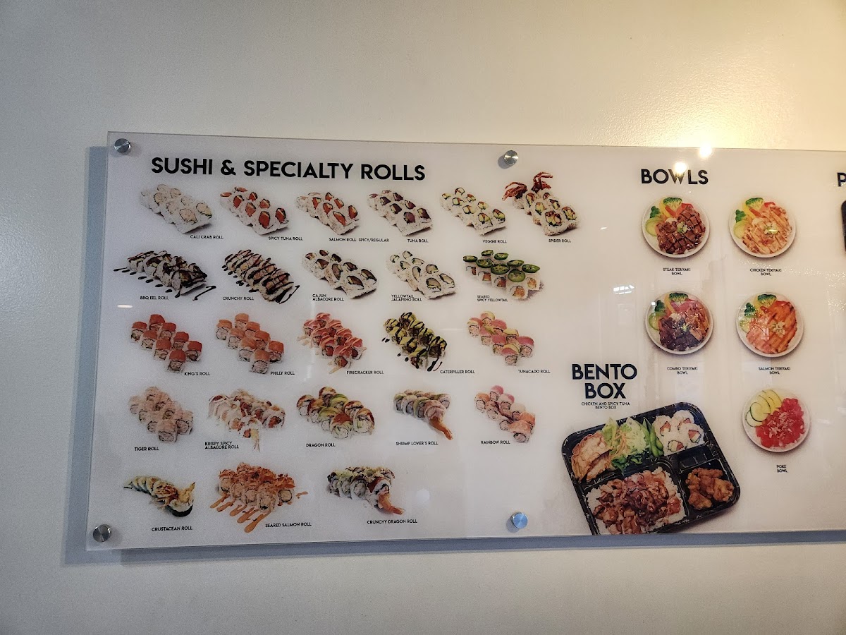 The menu offers a variety of Japanese-inspired dishes with a focus on sushi and teriyaki options. It is arranged into several main categories, allowing visitors to easily explore different types of food and beverages.